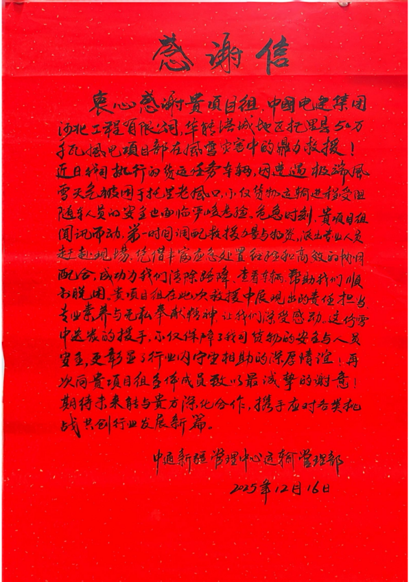 12月21日,中通新疆管理中心運輸管理部專程來到河北工程公司華能塔城托里縣50萬千瓦風(fēng)電項目部,送上錦旗和感謝信。錦旗上“暴風(fēng)雪中伸援手,救命之恩千鈞重”14 個大字格外醒目,字里行間滿是對救援人員的誠摯敬意。原來兩名中通職工是來向華能塔城托里縣項目部的救命之恩表達感謝的。 事情經(jīng)過是這樣。12月12日,河北工程公司華能塔城托里縣50萬千瓦風(fēng)電項目所在地遭遇極端惡劣天氣,一天一夜的白毛風(fēng)裹挾著風(fēng)吹雪肆虐,最高風(fēng)速達14級,現(xiàn)場能見度僅15米,往日通暢的道路被風(fēng)雪掩埋,陷入一片白茫茫之中。 當(dāng)日,2名中通工作人員駕駛配送車輛前往偏遠鄉(xiāng)鎮(zhèn)運送物資,行至距離項目部1公里處時,車輛被厚重的風(fēng)吹雪圍困,進退兩難。彼時氣溫驟降至零下20攝氏度,車輛燃油逐漸耗盡,手機信號時斷時續(xù),兩人陷入孤立無援的危急境地。 就在絕望之際,他們看到了1輛鏟車和3輛越野車隊正途經(jīng)此地,連忙發(fā)出求救信號。項目部人員收到求救信號后,馬上聯(lián)系項目部請求支援并對被困人員展開救援。他們先安排兩名工作人員搭乘越野車前往項目營地避難,同時調(diào)度鏟車清理道路積雪,一邊清障一邊牽引被困配送車輛。風(fēng)雪交加中短短一公里的路程,救援隊伍足足奮戰(zhàn)了3小時,最終成功將被困車輛拖至安全地帶。到達項目部后,工作人員還為兩名被困人員準(zhǔn)備了暫住房間,送上熱水和熱乎的飯菜,驅(qū)散了他們身上的寒意。 兩名被困人員被救助后表示,這次獲救經(jīng)歷讓他們深切感受到了河北工程人的責(zé)任與溫情,也體會到了“電建大家庭”的溫暖,今后會將這份善意轉(zhuǎn)化為工作動力,用心做好物資配送服務(wù)。 河北工程公司當(dāng)?shù)仨椖控撠?zé)人介紹,項目自開工以來,已多次參與地方義警執(zhí)勤、火災(zāi)撲救等救援行動。風(fēng)雪無情人有情,危難時刻見初心。一面錦旗、一封感謝信,既是對救援工作的肯定,更是對責(zé)任擔(dān)當(dāng)?shù)囊娮C,為寒冷的冬日增添了濃濃的溫情。作為中國電建集團的一員,河北工程公司將繼續(xù)踐行央企使命,為地方發(fā)展和群眾安危保駕護航。 ? |
