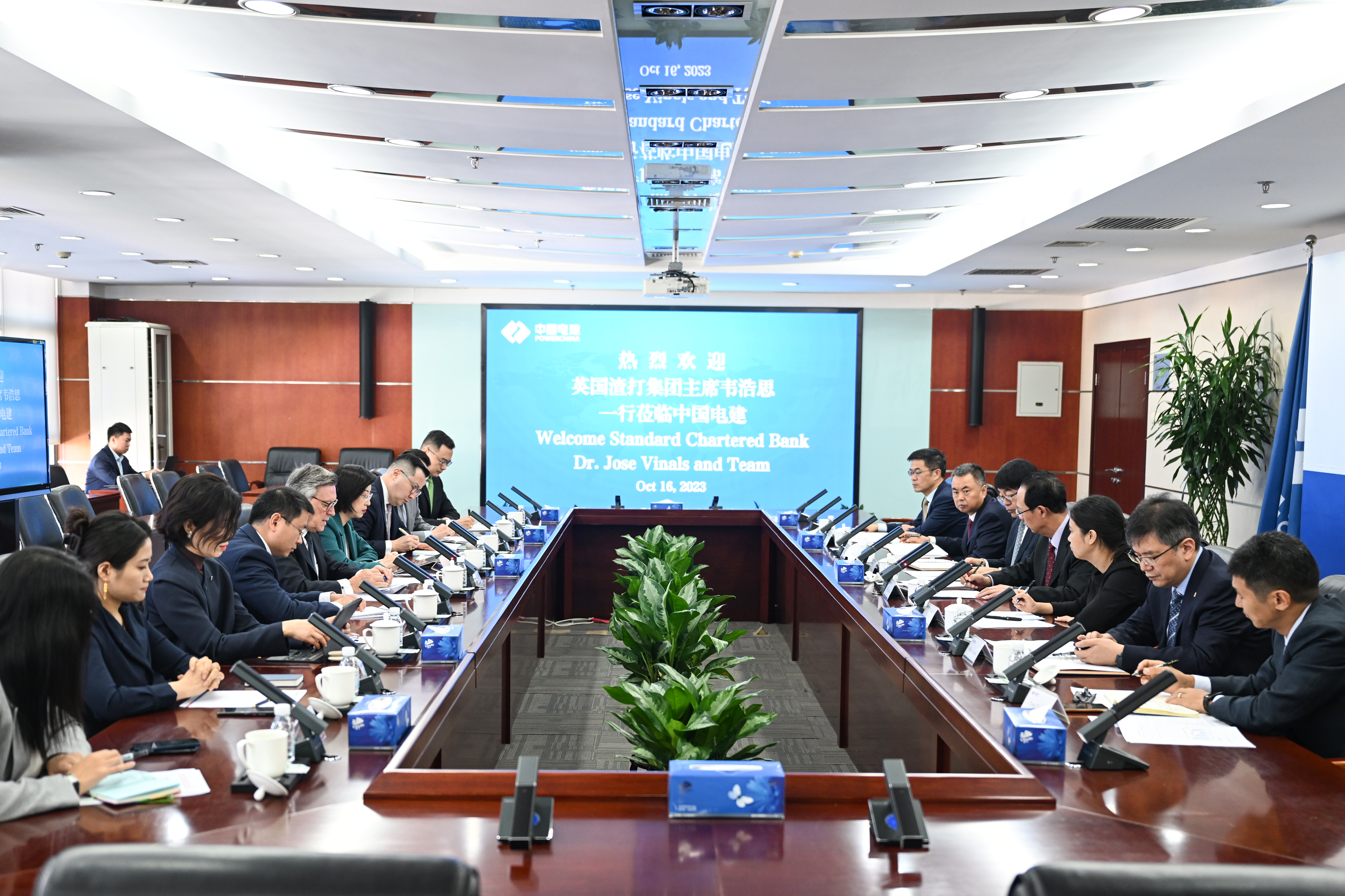 丁焰章對韋浩思一行到訪表示歡迎,并介紹了公司的戰(zhàn)略規(guī)劃及核心業(yè)務(wù)。他表示,中國電建在“水、能、砂、城、數(shù)”領(lǐng)域具有“投建營”全產(chǎn)業(yè)鏈一體化優(yōu)勢,是全球清潔低碳能源、水資源與環(huán)境建設(shè)的引領(lǐng)者,全球基礎(chǔ)設(shè)施互聯(lián)互通的骨干力量,服務(wù)“一帶一路”建設(shè)的龍頭企業(yè)。作為一家全球化的企業(yè),中國電建緊跟國家“一帶一路”倡議,堅(jiān)持海外優(yōu)先發(fā)展戰(zhàn)略,大力推進(jìn)綠色發(fā)展、低碳發(fā)展、高質(zhì)量發(fā)展,深耕屬地化管理,積極履行社會責(zé)任,與當(dāng)?shù)厣鐓^(qū)和諧共生、共同發(fā)展。長期以來,中國電建與渣打集團(tuán)建立了良好的合作關(guān)系,希望雙方在海外融資等領(lǐng)域進(jìn)一步加強(qiáng)合作,實(shí)現(xiàn)互利共贏。